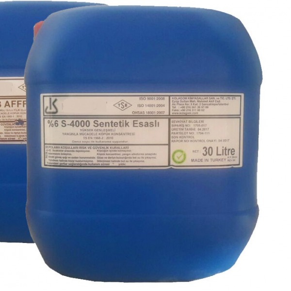 ÜRÜN ÖZELLİKLERİ: Sentetik esaslı yüksek genleşmeli yangın söndürme köpük konsantresidir. Yangınla ilk temasta yüksek oranda buhar çıkmasına neden olarak yangındaki oksijeni azaltıp yangını boğarak, sönmesine sebep olur. Çevre: S 4000 %3 doğada çözünür. Sudaki canlılar üzerinde düşük toksisitegösterir. ISO 14001:2004 belgesine sahip sistemimizle desteklenmektedir Uygulama Alanları: A ve B sınıfı yangınlarda;ıslanabilen malzemeler linyit, kömür, kotton, pamuk, kağıt,odun endüstrilerinde;taşınabilir ve sabit sistemlerinde S4000 %3 lık kullanıma uygundur. Performans & Güvenilirlik: S 4000 % kalıcı söndürme performansı ve güvenilir bir ürün kalitesi için kalite kontrol laboratuvarında standartlara uygun olarak test edilmekte ve ISO 9001:2008 belgesine sahip sistemimizle desteklenmektedir. Onay: TS EN 1568 kapsamında TSE’den belgelendirilmiştir. Ekipmanlar: Sistemlerde su ile %3 oranında karıştırılarak kullanılır. (3 birim köpük kansatresi, 97 birim su) Uyumluluk: Deniz suyu ve çeşme suyu ile kullanılabilir. Sistemlerde Kuru söndürme tozları ile birlikte veya farklı zaman dilimlerinde kullanılabilir. Fiziksel ve Kimyasal Özellikler: Görünüş.......................................................Şeffaf, Berrak Yoğunluk .....................................................1.04 g/mL pH (20°C).....................................................7.0 Viskozite (20°C) ...........................................10cp Çökelti miktarı ............................................. Yok Drenaj %50, dakika.......................................4-12 Donma noktası (0 C)......................................İsteğe bağlı Ambalaj bilgileri: Ambalaj Boyut Brüt Ağırlık 30L bidon..................................................29,4 x 36 cm...30-35 kg Depolama Koşulları: -Çalışma sıcaklığı -150 C ile +500 C arasıdır. -Islanmasını önleyiniz. -Direkt güneş ışığı ve ısıdan koruyunuz. -Orijinal ambalajında saklayınız. -Bu koşullar sağlandığında kullanım ömrü 5 yıldır
