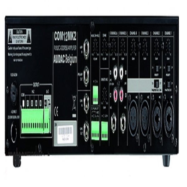 COM12 ve COM24, 240W’a kadar güçleriyle ortak adresli amplifikatörleridirler. Her türden bağlantı amaçları için çok çeşitli giriş olasılıklarıyla tasarlanmışlardır. Mic / Line level, 4 balanced Mic / Line girişleri arasında değiştirilebilen, 2’sinin de XLR/Jack hibrid konektörler aracılığıyla kullanıldığı yerde devreye giren ve böylece önceliği sağlayan fantom güçlü, 2 dengesiz stereo line seviyesi girişle donatılmıştır. Bu şekilde maksimum 3 dengeli mikrofon bağlanabilir. Çıkış seviyesi, 5 yüksek empedans 100V mono çıkış zonlarında veya düşük empedans 4 Ohm mono çıkış olarak mevcuttur. Diğer mevcut özellikleri arasında, bir lin giriş ve çıkışı, bir amp girişi ve pre-amp çıkışı, entegre bir melodi modülü, bir uzak mikrofon girişi ve bir çağrı cihazı ünitesini bağlama olasılığı yer alır. DC bozulması, kısa devre, aşırı ısınma ve aşırı yüklemeye karşı koruyan ve gerekli olduğunda sinyali sınırlayan ileri seviye koruma devresine sahiptir. Kanal seçim ve ses kontrolleri, 2-bant ton kontrolü, ana ses kontrolü ve VU LED çubuğu ve clipping LED’ler gibi tüm kontrol fonksiyonları amplifikatörün ön tarafında yer alır.