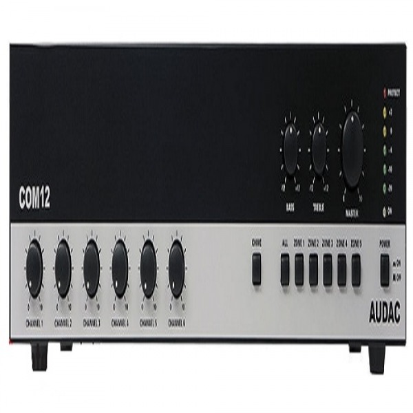 AUDAC COM12 Common Adder Amplifier 5 x 100V selectable output zone Low impedance 4 Ω output 2 Stereo unbalanced line level input 2 Mono balanced line / mic level input Priority 2 Mono balanced line / mic level input 15V phantom power over 4 balanced mic inputs Up to 6 microphones Bass and treble tone control (2-band) Pager input (priority line input)